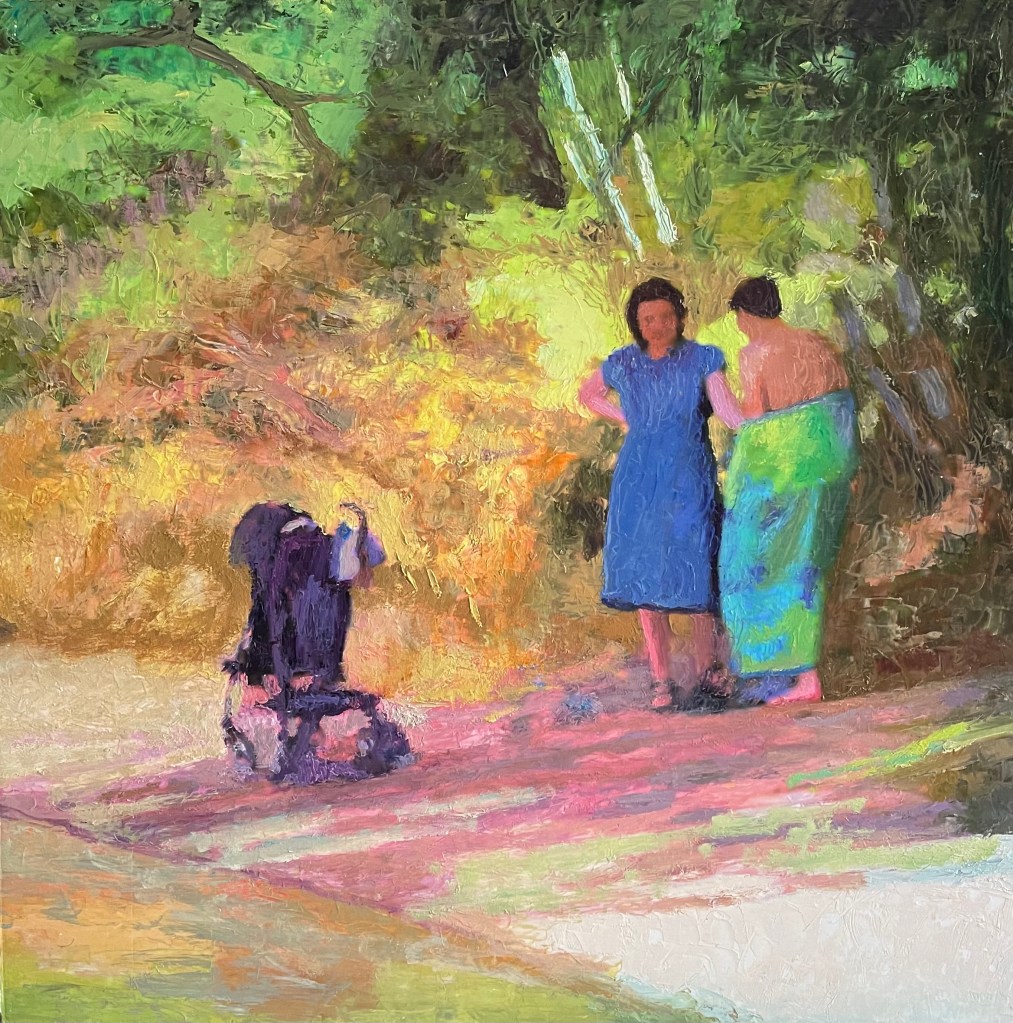 Two People With Carriage At Walden Pond. Oil on Board. 20″ x 20″. $1,200
