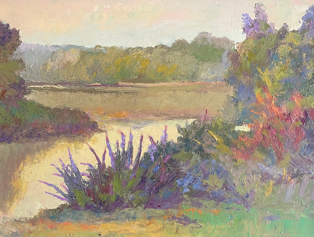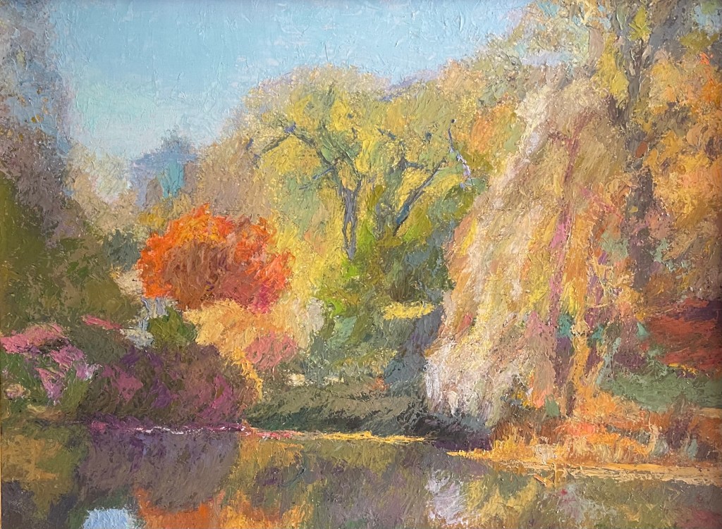 Late Afternoon At Auburn Pond. Oil on Board. 16″ x 20″. $960