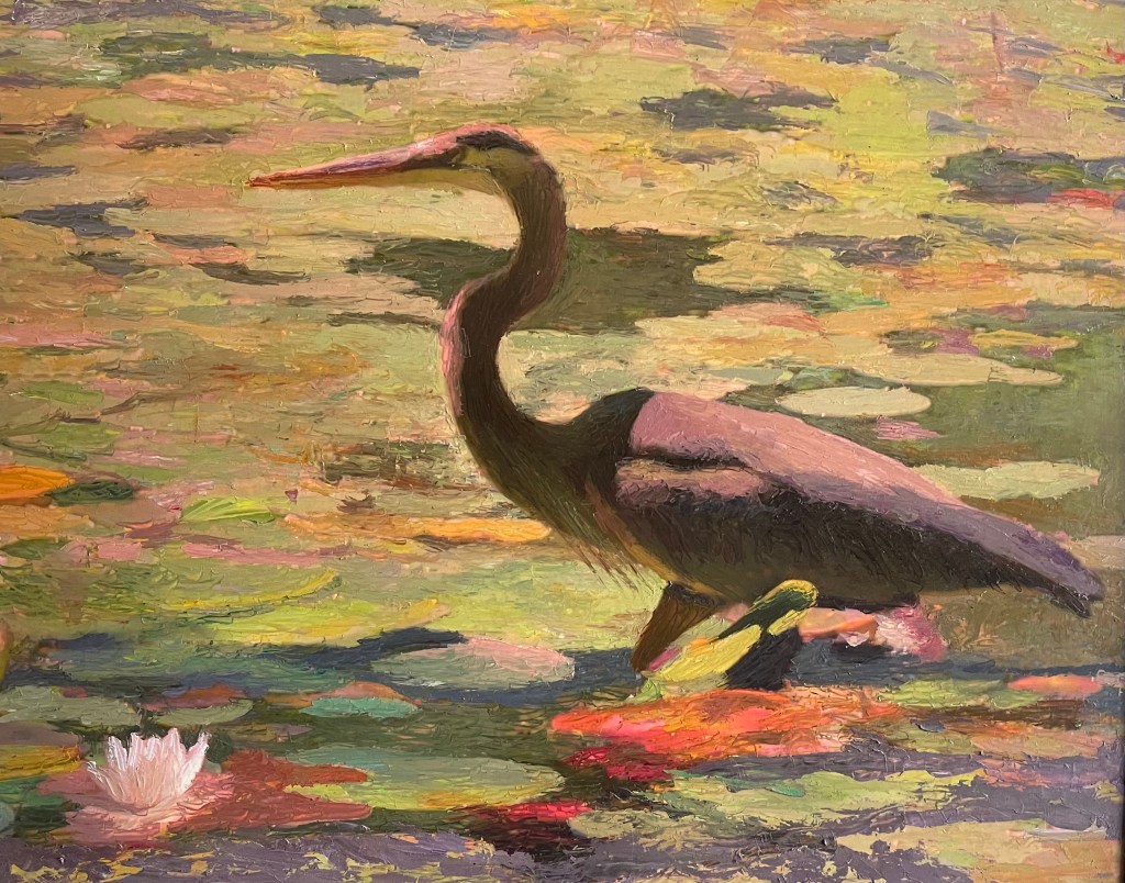 Great Blue Heron Among Waterlilies. Oil on Board. 16″ x 20″ $960