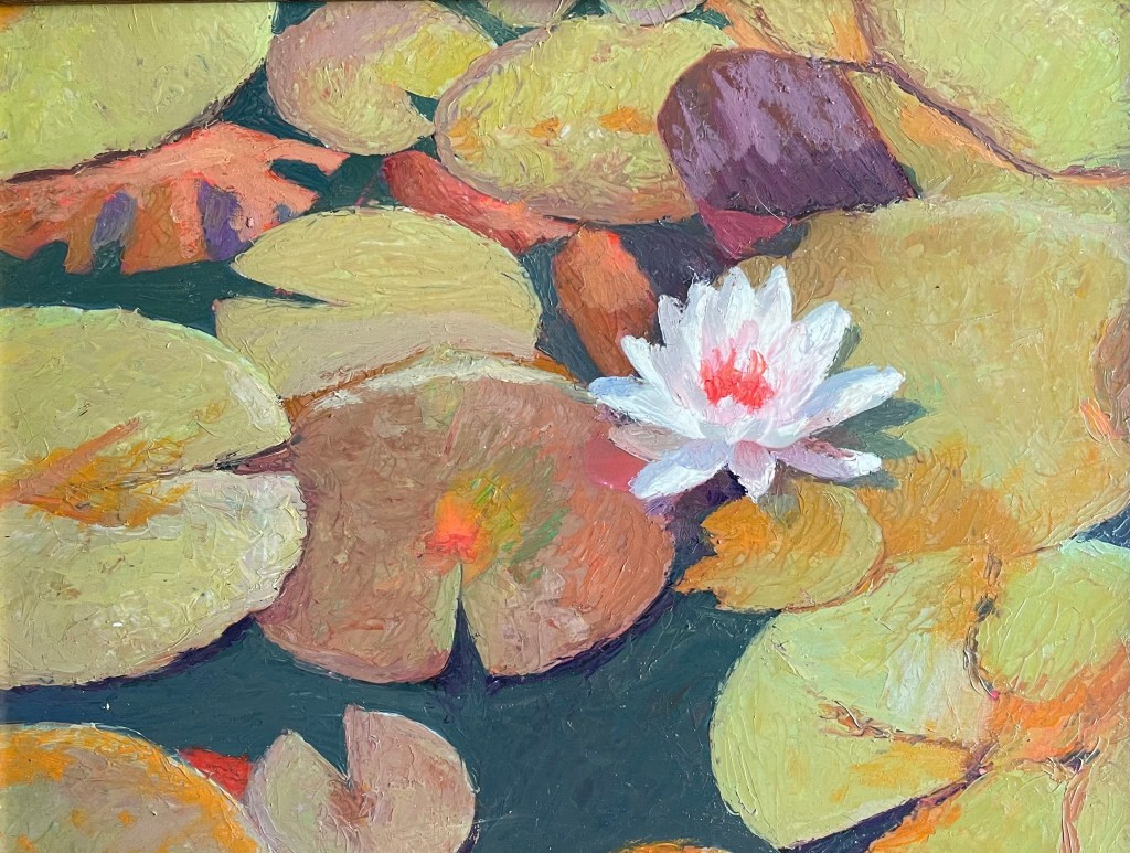 Single Waterlily. Oil on Board. 14″ x 18″. $750