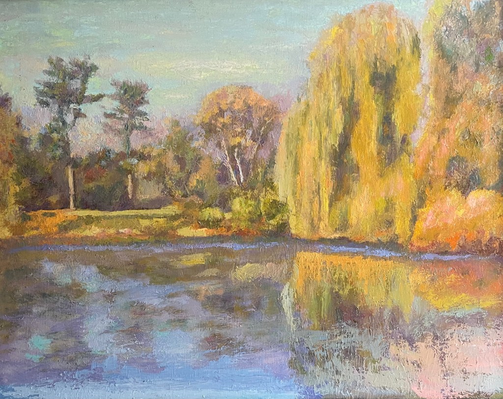 Sunny Day At Auburn Pond. Oil on Board. 18″ x 24″. $1,300