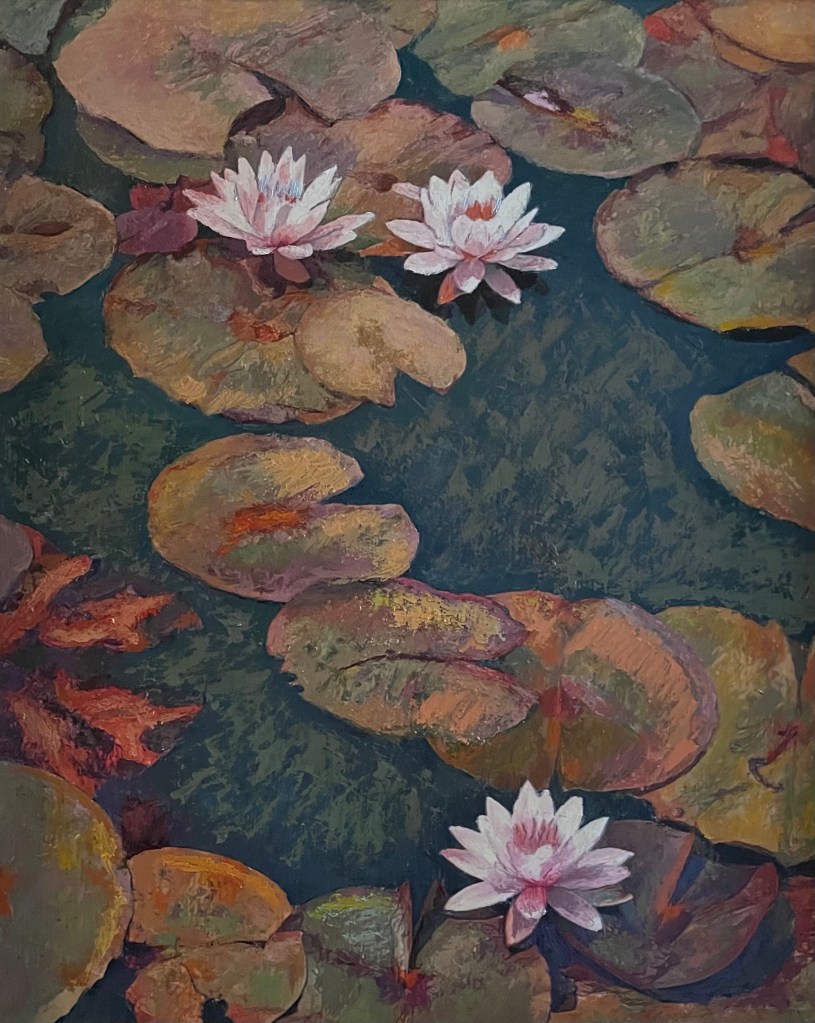 Three Waterlilies. Oil on Board. 24″ x 30″. $2,200