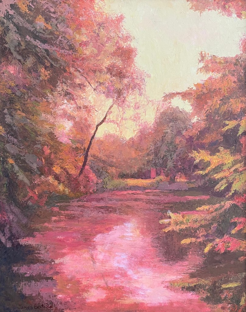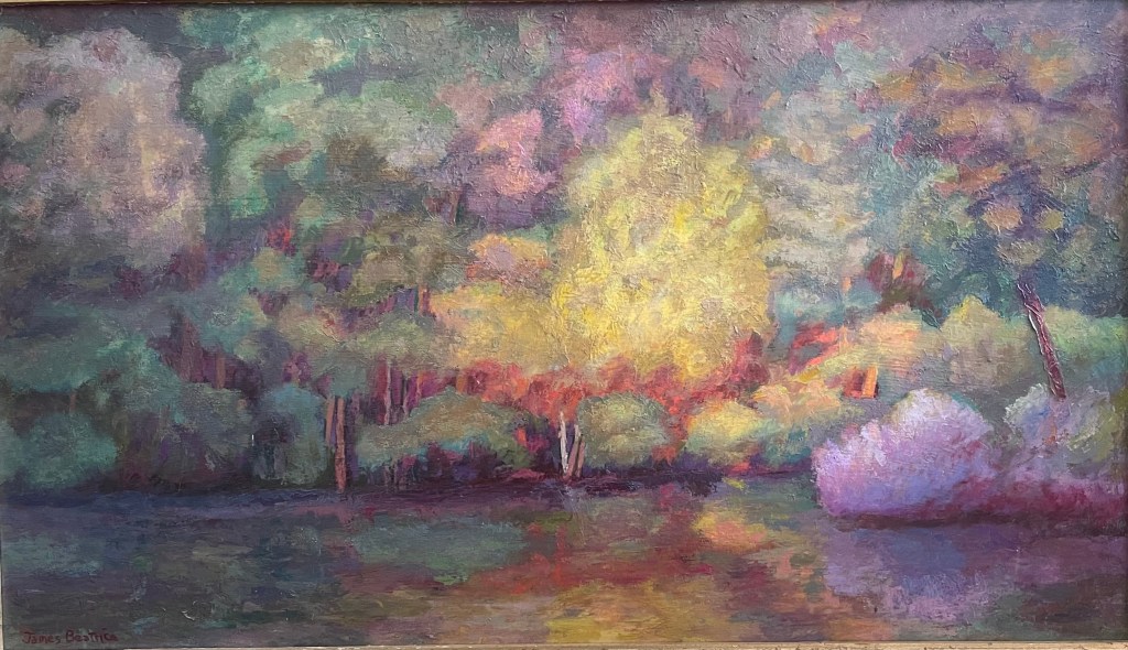 Afternoon Trees on Auburn Pond. Oil on Board. 16″ x 20″. $960